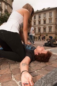 Szóval ott feküdtem, a töltés alján, a kocsi félig a tóban, a töltés tetején a többi imitátor, skizofrén, elmebeteg, drogos, részeg, süketnéma és autista szerepkörbe osztva. Nos, az ellátóink megérkeztek. Számomra nagyon új, izgalmas és félelmetes volt ez az egész, mivel az imitálásnak a leglényegesebb része hogy a balesetet szenvedett embereknek nem csak a lehetséges sérüléseit, hanem a viselkedését is át kell adnunk azoknak akik rajtunk segítenek. Szóval bele kellett élnem magam, el kellett hitetnem magammal és másokkal hogy tényleg fáj, tényleg vérzek, tényleg félek, hogy a barátnőim meg fognak halni, pedig mi csak egy fesztiválról tartottunk hazafele. Az első imitálásomnál pont az volt a nehéz, hogy a sok téves riasztás miatt ki-be ugráltam a szerepemben, ami olyan mintha folyton fel-le kapcsolgatnánk a villanyt. (Egy idő után kiégne, ami velem is megtörtént, a második imitálás résznél fejtem ki.) Szóval az imitálás nagyon nehéz, lelkileg nagyon megterhelő, de ez mind eltörpül amellett hogy milyen nagyszerű és nemes cél érdekében fagyoskodtunk a roncsokban, szúnyog-eledelként. Hiszen mi voltunk azokat alakítottuk, akiknek talán az élete múlhat az ellátóink most szerzett tapasztalatán. Nagy teher, nagy súly, nagy áldozat, egy nemes célért, nemes lelkű emberekkel. Mondjátok hogy nem érte meg! A helyzet következő volt: úgy döntöttek, először Dórit szállítják el, pontosabban, vágják ki az autóból, mivel ő az ablakon be tudott mászni, de kifelé már vágni kellett. Mivel aggódtam Dóri miatt, folyamatosan sírtam, és mindahányszor megrázkódott az autó, vagy a lezúduló víz miatt fellazult a talaj alattunk, hisztirohamot kaptam, amit egy mellettem lévő ellátó remekül orvosolt. Viszont amíg Dórit vágták, addig én simán “elvéreztem” a platón, Szindy pedig a kocsi mozgásától belesett volna a vízbe, ha ez valódi helyzet lett volna, mivel vele éppen akkor nem törődtek, pedig a súlyos sérülteket (a nyílt törötteket, akiknek idegen test szúrta át a testét, sok vért vesztettek és az eszméletleneket) kellene először elszállítani, utána jönnek a könnyű sérültek. Mivel Szindy veszélyes helyzetben volt a motorháztetőn, én őt vittem volna el először, majd mivel Dóri magához tért, magamat (mert én sok vért vesztettem, Dórinak viszont egy sérülés volt a homlokán) szállítottam volna el a helyszínről. Mikor Dórit vágták ki, már akkor tudtam, hogy az imitáció első része nem fog megfelelni a “kritériumoknak”. Miután Dórit kiszedték, következtem én. Be sem kötöztek, nagy nehezen board-ra emeltek, amire nem szíjaztak le, ha nem kapaszkodtam volna teljesen lecsúszok… A szilánkok a vállamban teljesen más helyzetben kerültek ki mint ahogy én odaraktam őket, az antenna a combomban kb 90°-ot vándorolt, ami ugye valós helyzetben nem lett volna olyan szerencsés. Nos, felkerültem a forgatagba, és Mónival egymásnak kiabáltunk, hogy zavarjuk az ellátók munkáját. Engem megtaláltak a pszichológusok, akik azon voltak hogy “segítsenek nekem”. Háááát jóóó… Azzal tudtak volna segíteni ha mondjuk bekötöztek volna, ami még mindig nem történt meg, bárminemű sírásomra, jajgatásomra és kérésemre sem tudtak reagálni, miszerint fázom, és attól tartok lassan elvérzek. Gabszi, aki szerintem a világ legjobb elmebetegét játszotta, folyamatosan kitüntetett a figyelmével, miszerint valami áll ki a lábamból, és előszeretettel piszkálta az infúziókat, miszerint azok mérgek, csupa rossz, amit nem szabad adni a sérülteknek. A Gabszival mászkáló pszichológus valószínűleg praxisának legmókásabb részén van túl, ugyanis mikor Gabszi közölte h “Leülök.”, a doki mézesmázosan érdeklődött hogy “De akkor ugye itt maradsz?” majd a válasz pókerarccal: “Leülök.”. Majd mikor a doktor elfordult, drága kis elmeháborodottunk elkezdte körbefutkosni a mentőautót, elveszett sógornője után kutatva. Elég nehéz volt tartani a hisztit és a sírást Gabszit és Vikit látva, miközben utóbbi a leghátborzongatóbb mosollyal tekerte le a karjáról a kötszert. Meg persze a szlovák Dávid, aki skizofrén szerepkörben múlatta az időt, neki ment az embereknek, agresszív volt, és majdnem rám esett a sok “nyugtatótól amit kapott”. Nos, ami számomra a legzavaróbb volt, hogy a járóképes könnyű sérülteket hamarabb elszállították, mint a komolyan sérülteket. Engem, akinek a lábában és a vállában egy idegen test volt, el sem szállították, jószerivel be sem kötöztek, de 2x kaptam nyugtatót, és a imitálás vége felé még infúziót is bekötöttek. Majd kb 1 óra fekvés után, átfagyva és felettébb nyűgösen egy férfi közölte hogy “ropi”, keljünk fel, satöbbi. Mielőtt leszerelkezhettem volna, legalább 4-en állítottak meg, hogy lefotózhassák a sérüléseimet, ami nagyon jól esett, mert ők is lelkesek és aranyosak voltak. 🙂 Viszont ezzel az ellátással szerintem jóformán senki sem volt megelégedve, lehet hogy a megmentőink izgultak, nem voltak összeszokva, vagy rossz kedvük volt, sosem fogjuk megtudni. Mindezt mondom én úgy, hogy csak sírtam és akadályoztam, de szerintem mindenki jó, avagy rossz tapasztalatokkal mehetett haza, és a járásbiztonságiak is legközelebb jobban fogják tudni hogy ilyen helyzetben mi a teendő.