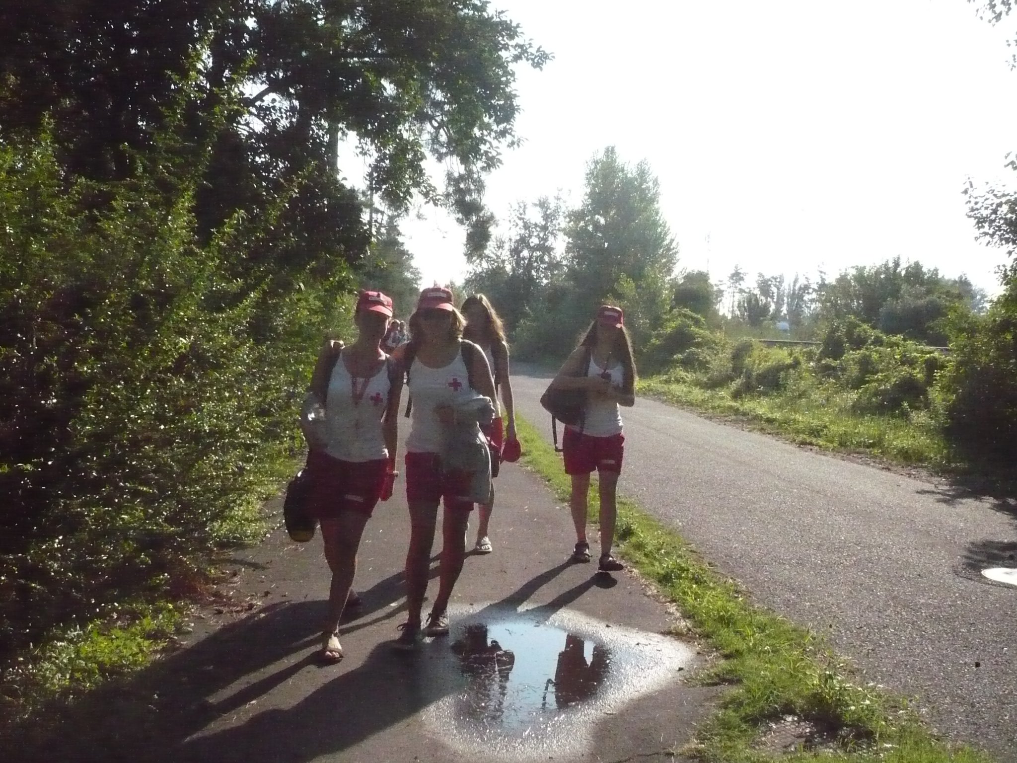 Leszállás a HÉV-ről, Ph hívása (ha-ha) hogy mégis merre induljunk? Útirány megadva, csomagok fel, imitátorok, indulás! Hosszas menetelés után megérkeztünk a Szentendrei tűzoltóállomáshoz, egy nagy füves területen már elég sok külföldi és magyar Vöröskeresztes sátor volt felállítva, körülöttük fényvisszaverős ruhában igyekvő emberekkel. Vidámparkba illő forgatag, idilli környezet, valóra vált álom. Nem tudom máshogy jellemezni. Bementünk a legnagyobb sátorba, lepakoltunk, majd eligazítottak minket a vezetőink, Szindy és Klári. Megkaptuk a dolgunkat, a helyszínt, elkezdtünk készülni. Átöltözés, gumicsizma felhúzása, satöbbi. Kisebb-nagyobb késéssel meg is indultak csapataink, gyalogszerrel, később motorcsónakkal érkeztünk a szigetre, ahova az árvíz sodort el minket kicsiny falucskánkból. Körülbelül 20-an voltunk a szigeten, míg 7-en a parton voltak menekítendőek.